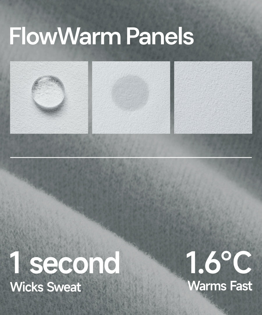 High-sweat zones like underarms and back feature FlowWarm panels that absorb moisture in 1 second and release heat, keeping you dry and comfortably warm through activity.
