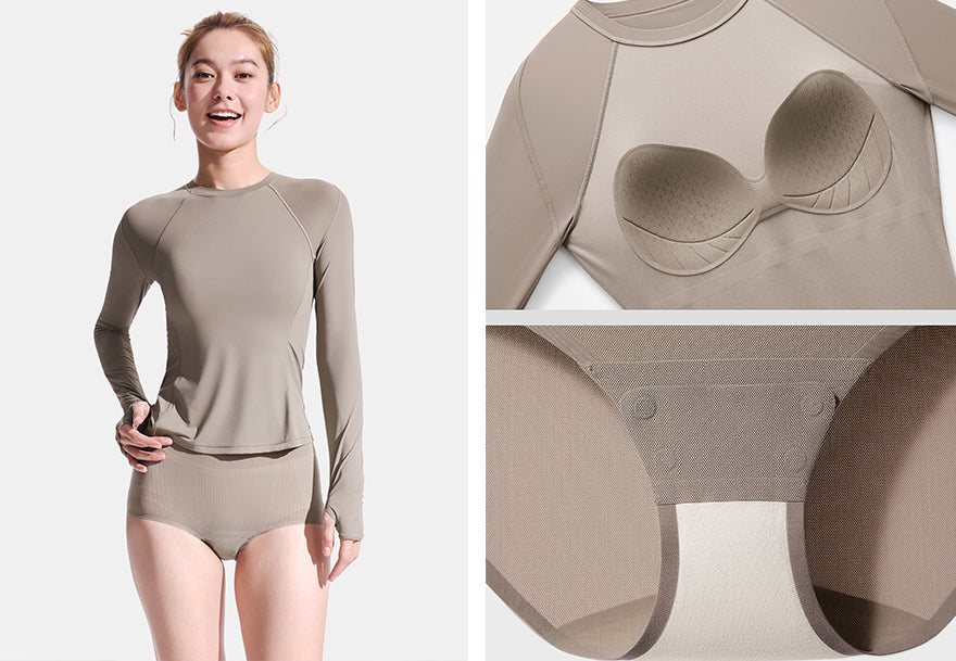 This shaping base layer features a built-in bra design with light sculpting, sun protection, and cooling comfort. It can be worn on its own or as a base layer, making daily dressing and outdoor wear easier and more streamlined.