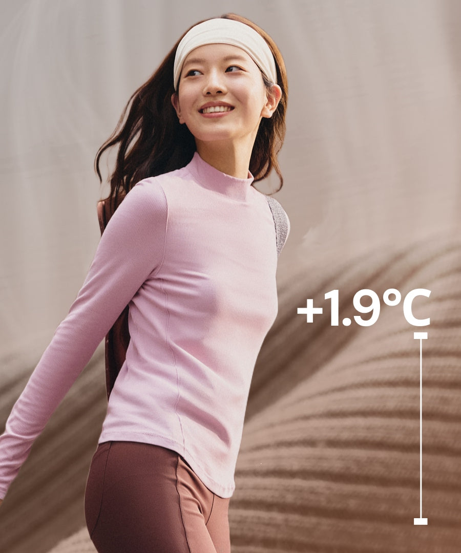 A close-fit mock neck seals in warmth, blocking wind, while far-infrared fibers gently raise temperature by approx. +1.9°C.