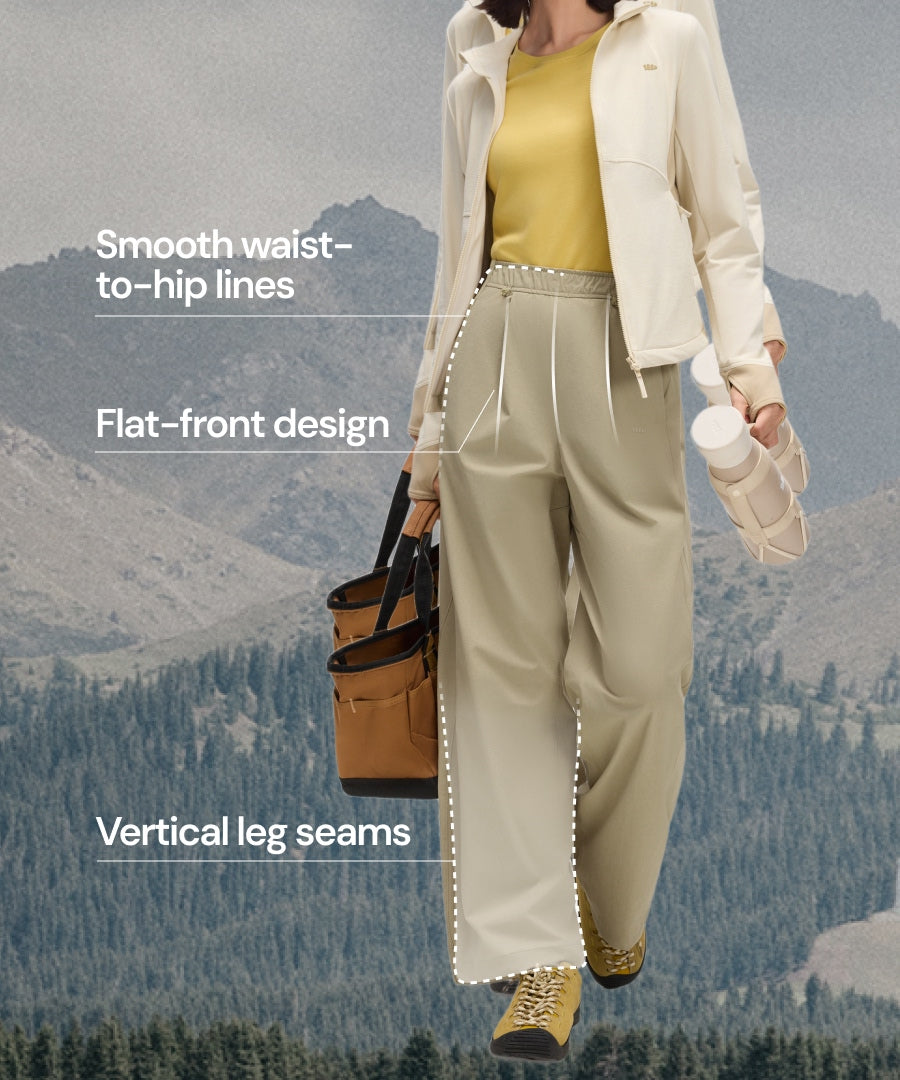 Flat-front design prevents bulging, smooth waist-to-hip lines create a streamlined look, and vertical leg seams elongate the silhouette while enhancing natural curves.