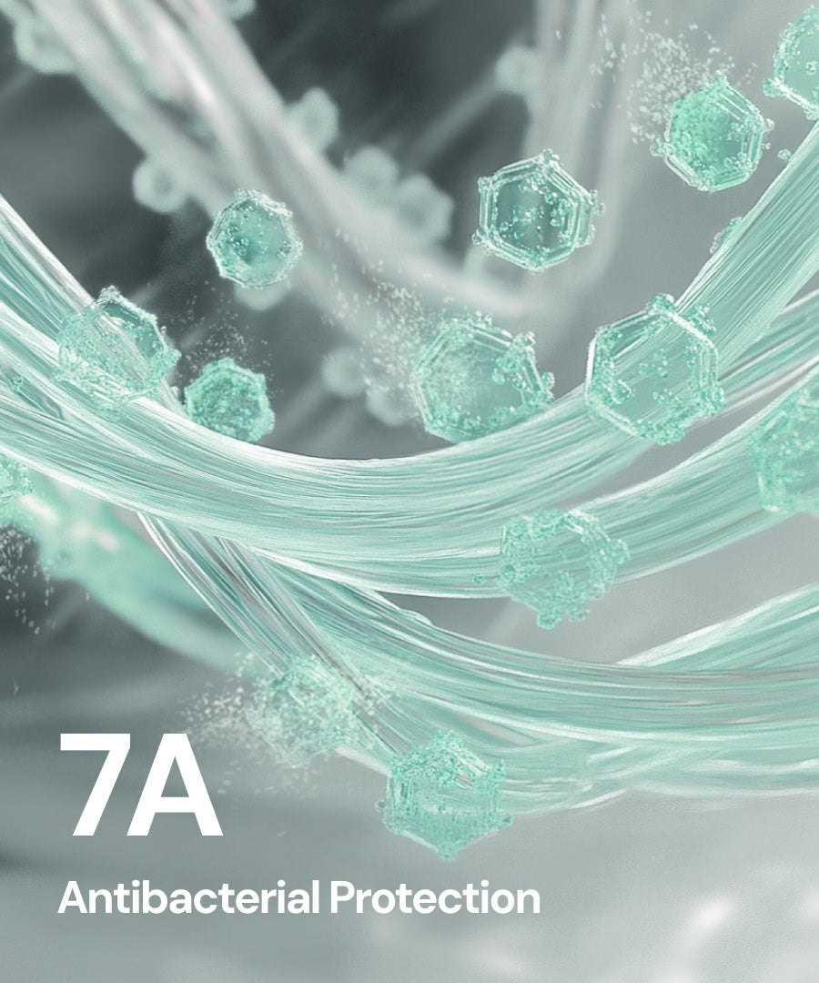 7A-grade antibacterial technology, effective after 150 washes, inhibits 99% of E. coli & Staphylococcus.