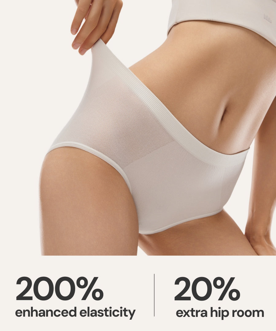 200% enhanced elasticity, 20% extra hip room, seamless sides for chafe-free, stay-put comfort.
