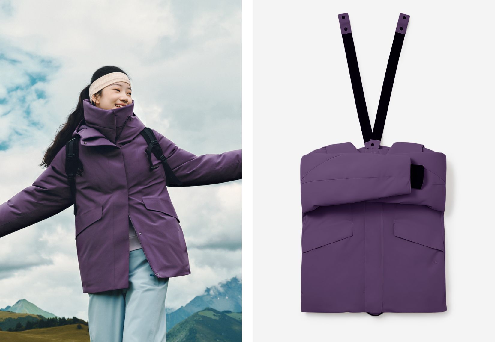 Designed with built-in carry straps, the jacket packs down easily into a lightweight form. Wear it or sling it over your shoulder — no bulk, no hassle.