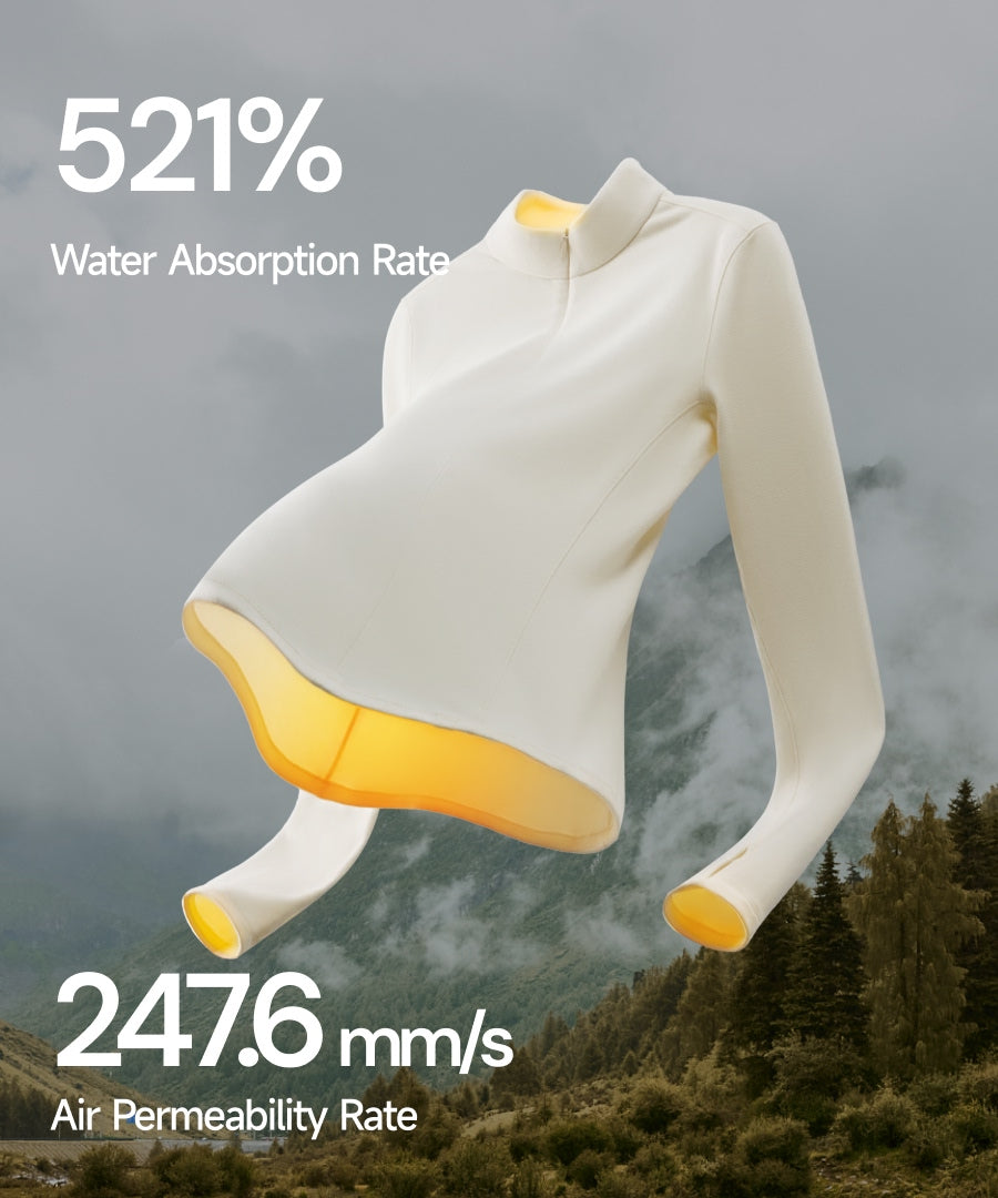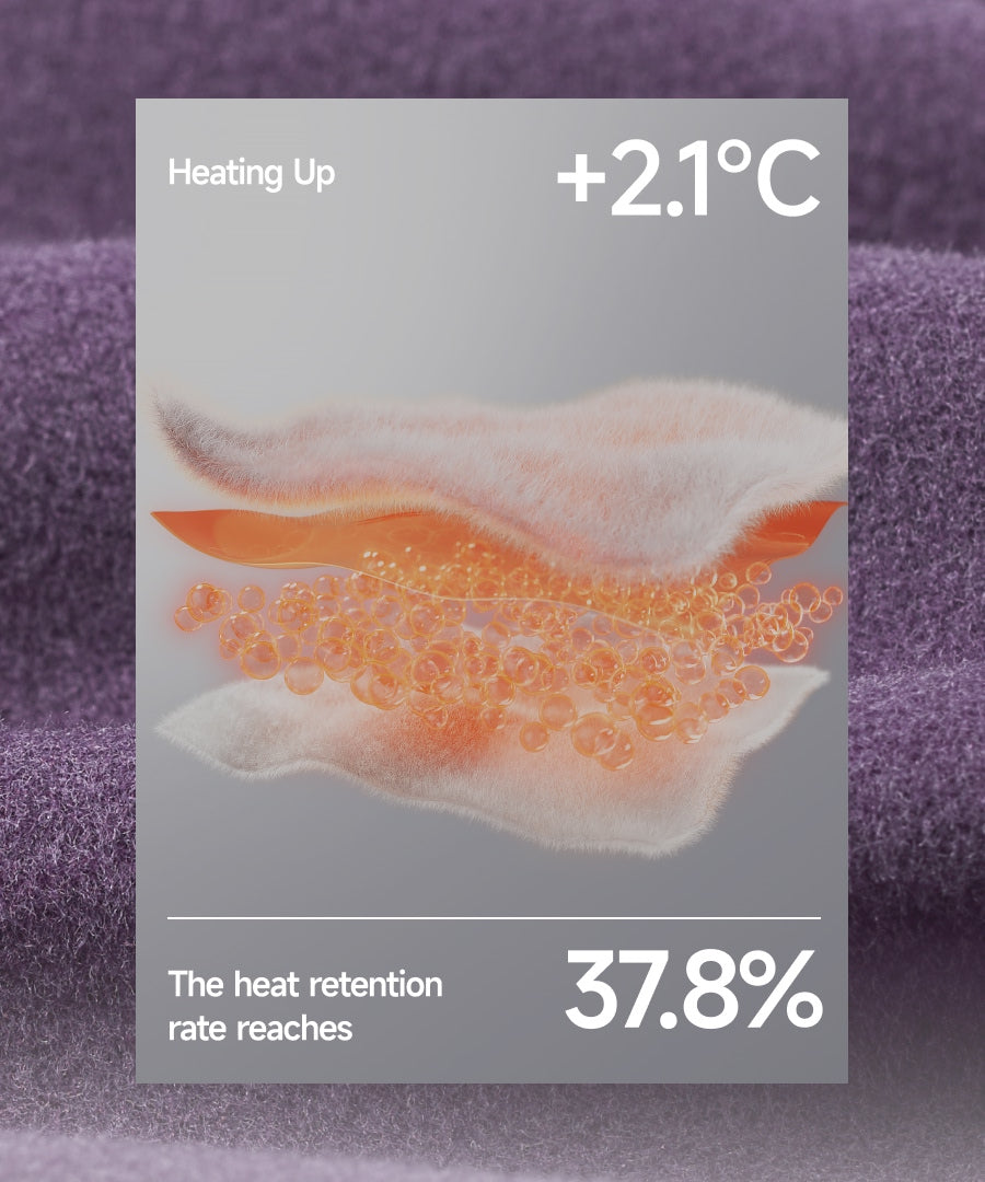 Double-brushed fleece and hollow-core fibers work together to boost warmth by +2.1°C and improve heat retention by 37.8%. Soft yet effective, it delivers lasting insulation without extra weight.
