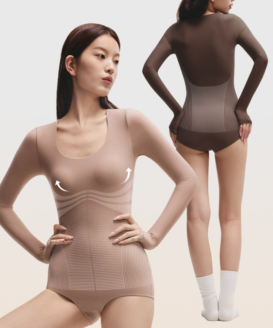 Strategic compression zones target the chest, waist, back, and lower belly. With a double-layered structure, the bodysuit shapes and smooths key areas while staying breathable and soft to the skin.