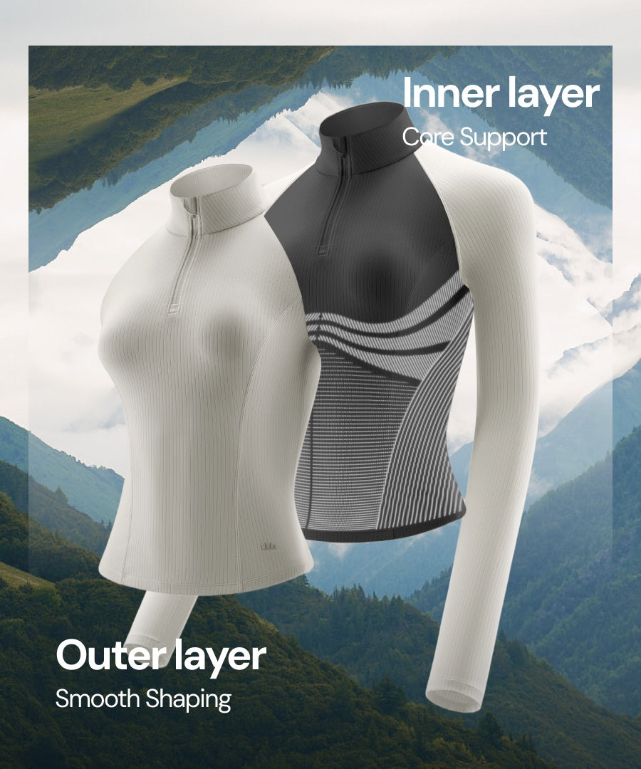 - Dual-layer compression: core-tightening inner layer + smoothing outer layer
