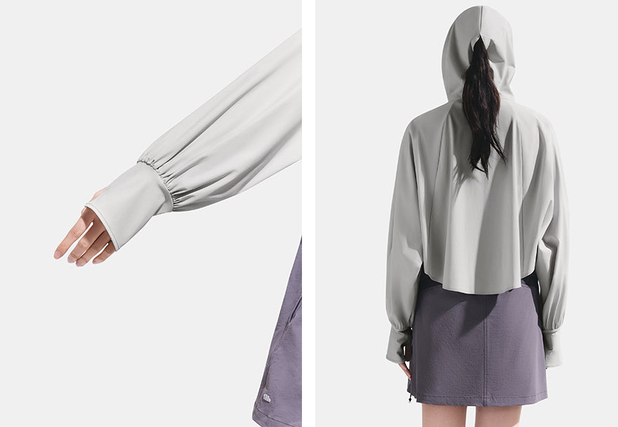 - Thumbhole cuffs to extend sun protection to the hands