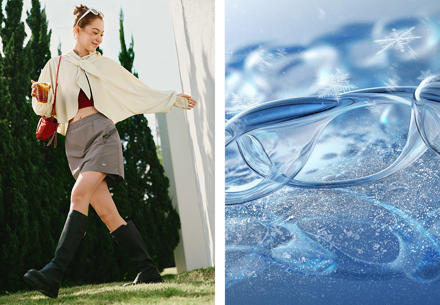 The floating structure reduces skin contact and promotes airflow, creating a light and breathable cooling experience.